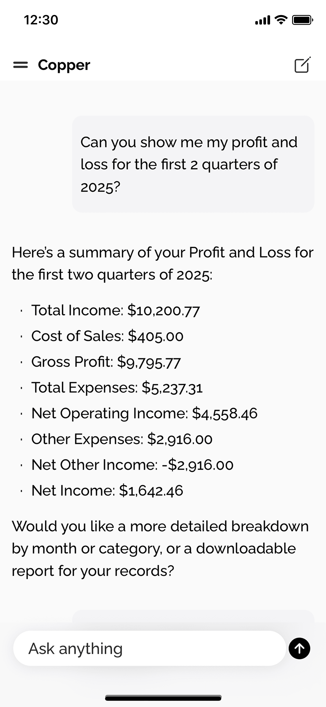 Connect QuickBooks and get instant answers about cash flow, expenses, and trends.