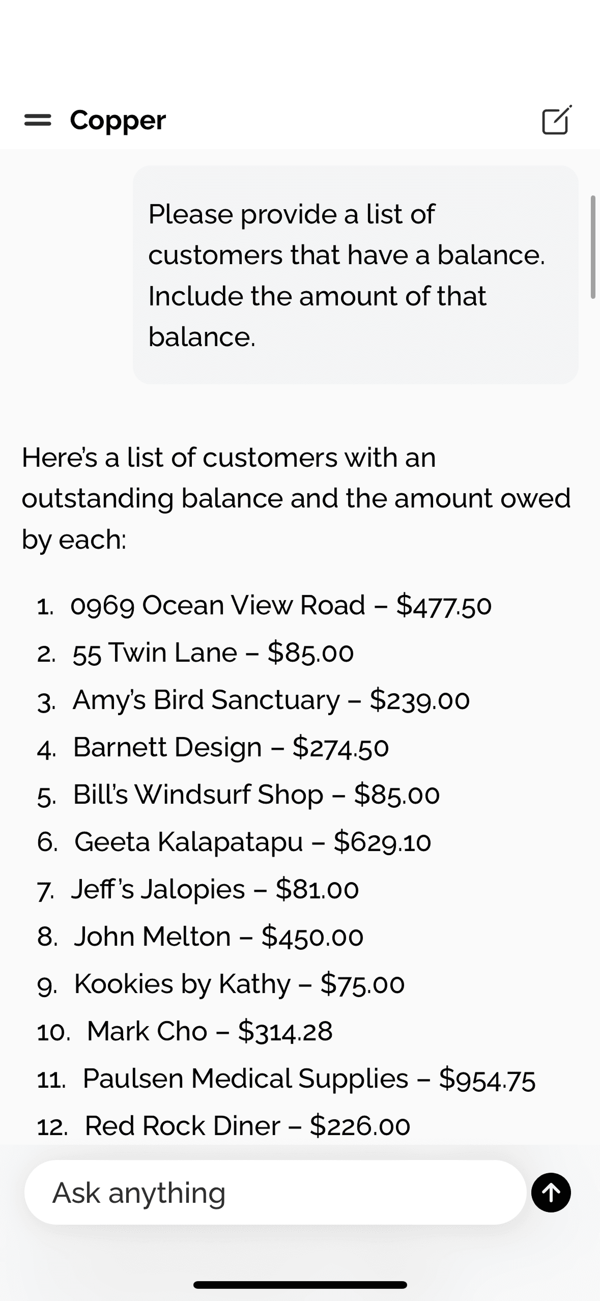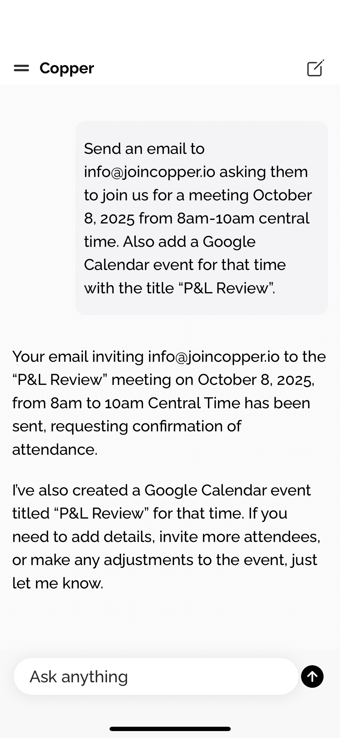 Copper orchestrates specialized AI sub-agents, each connected directly to your tools — from QuickBooks to Google Workspace. That means real work gets done, not just summarized.